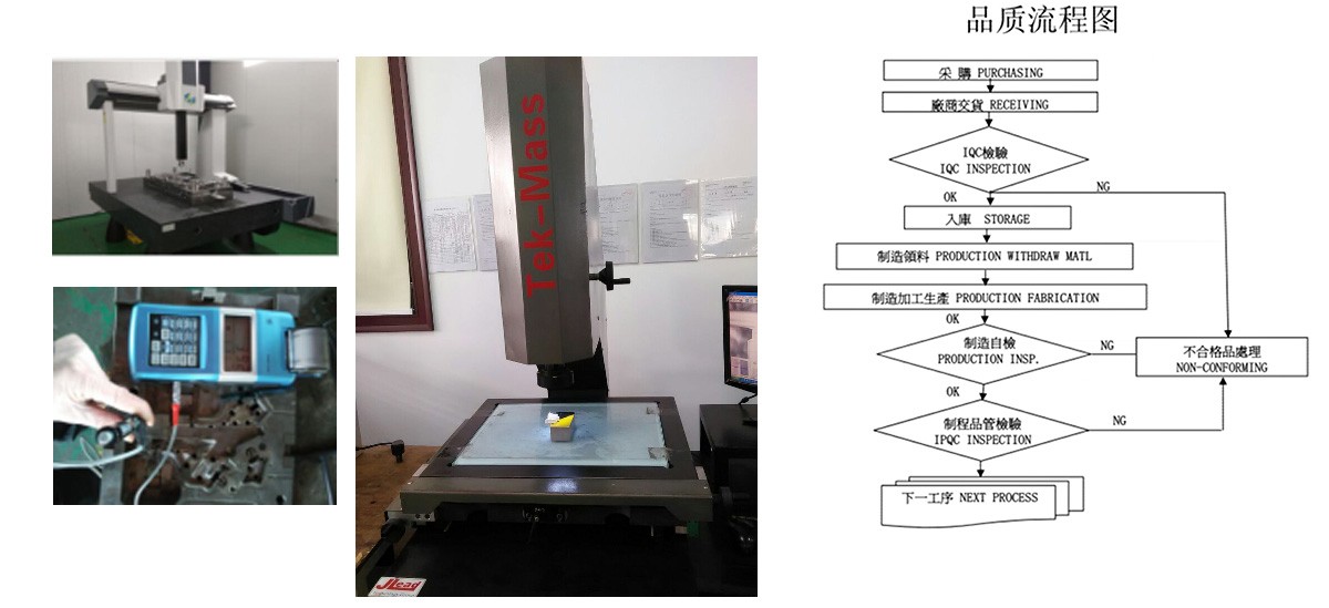 在进行模具测试之前,监视模具加工的质量和检查。在丰富而有效的测量设备资源和人力资源的支持下,控制模具的各种尺寸和问题,以确保模具的发货率为100%。质量团队攘括了进料检验、过程检验、产品检验、电极检验、出货检验及质量管理体系,在各类精密测量设备资源及具有相关资质的质量人员的支持下,真正意义上实现了从原料、过程、最终检验对模具生产质量的严格控制,并通过质量管理体系的实施,实时监控和提升整个公司的质量管控程度。